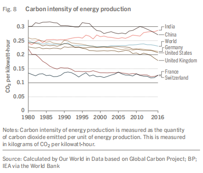 大卫指出,为了在不损失太多经济增长的情况下减少全球碳排放,我们必须更快地实现能源生产的脱碳。虽然目前一些国家在能源生产脱碳方面取得了快速进展,但在全球范围内趋势并不明显。例如,由于可再生能源的大规模部署,2012年至2016年间,英国能源生产中的碳强度下降了10%,其中风力发电占比近四分之一。由于核电在电力生产中的使用,法国的能源生产碳强度在25年内(1963年至1988年)降低了一半(见图8)。