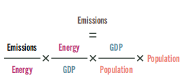 为进一步解释碳排放差异,大卫将国家总排放量分解为四个部分(如下图),分别是能源生产的排放强度(反映国家清洁能源生产的程度)、能源强度(反映生产国内生产总值所需能源)、人均GDP以及人口。他表示,如果要在不牺牲太多收入或减少人口的情况下减少排放,就需要提高能源效率,发展清洁能源。